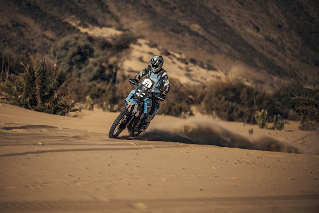 Trotz starker Winde und Sandstürme, die die Navigation zusätzlich erschwerten, zeigte er eine herausragende Leistung und beendete die Wertungsprüfung in vier Stunden, 57 Minuten und 32 Sekunden, um den Sieg mit zwei Minuten und 34 Sekunden Vorsprung zu erringen. Es war sein zweiter Etappensieg bei der Rallye. Der Franzose rückt in der Gesamtwertung auf den vierten Platz vor, nur 16 Minuten und sieben Sekunden hinter dem Führenden und ist weiterhin im Kampf um den Gesamtsieg.