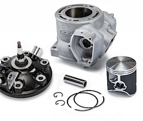 Kurbelwelle und Zylinder: Jetzt gleich mit dem Modell 300 2T. Der Hub wurde im Vergleich zu den Vormodellen verringert (von 72 mm auf 69,9 mm), weshalb die Bohrung vergrößert werden musste (von 66 mm auf 67,4 mm), um die 250 Kubikzentimeter beizubehalten. Der Zylinder wurde dann in seinen Überstromkanälen neu gestaltet und beherbergt nun einen neuen Spezialkolben.