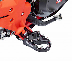 Fußrasten aus Ergal: Um stets die maximale Kontrolle zu haben und niemals den Kontakt zum Motorrad zu verlieren, besitzen die RR Race Modelle, Renn-Fußrasten aus Ergal mit austauschbaren Stahlstiften. Sie sind schmaler als früher, um die Bewegungen des Fußes zu erleichtern, aber besser im Hinblick auf den Grip.