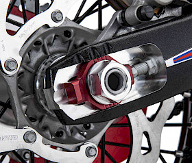Vorderachse mit Schnellspanner: Diese Komponente ist klar am rot eloxierten Schnellspanner erkennbar