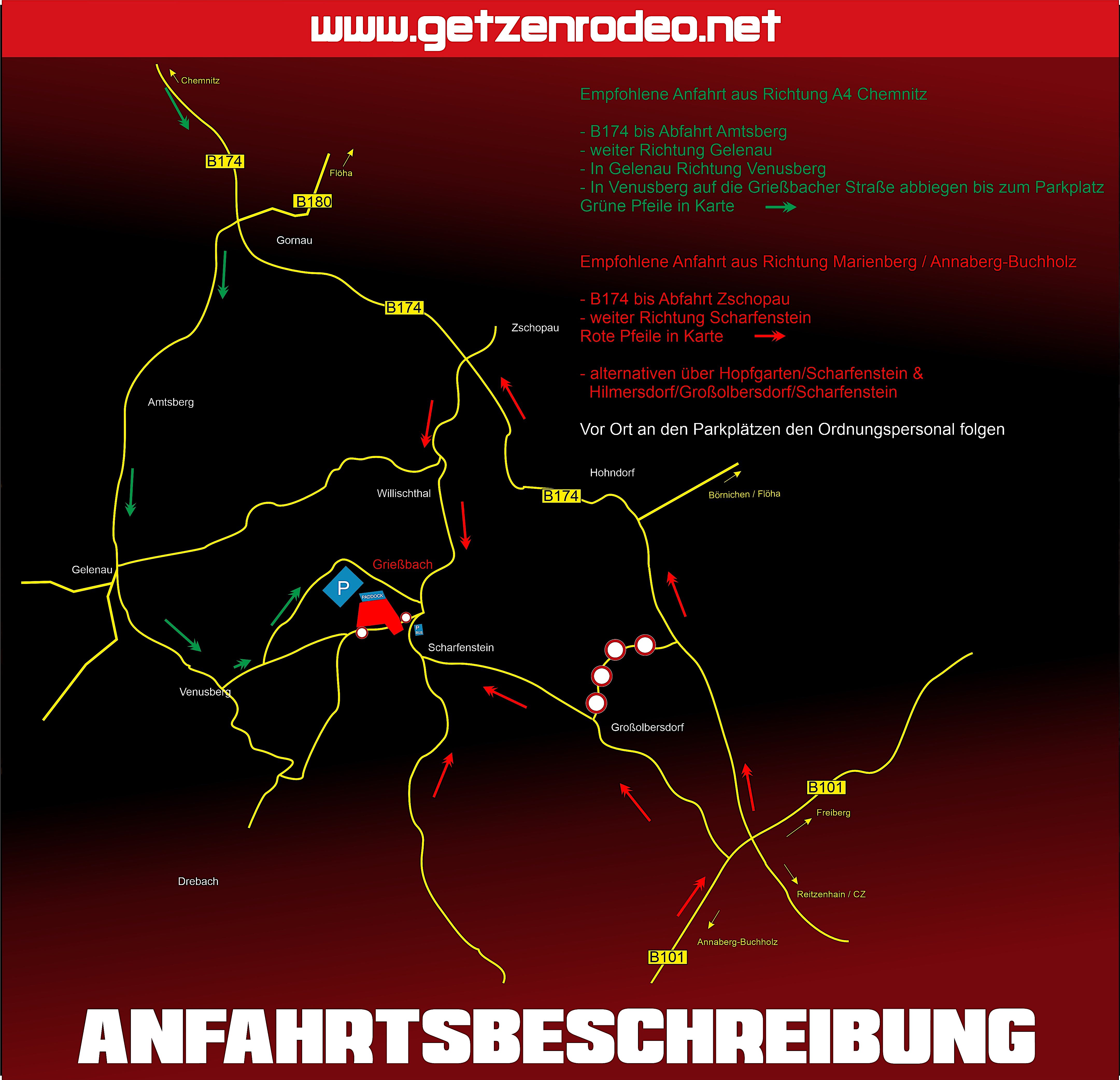 Aus Richtung Annaberg-Buchholz/Marienberg: über die B174 nach Zschopau und weiter durch Wilischthal nach Grießbach.