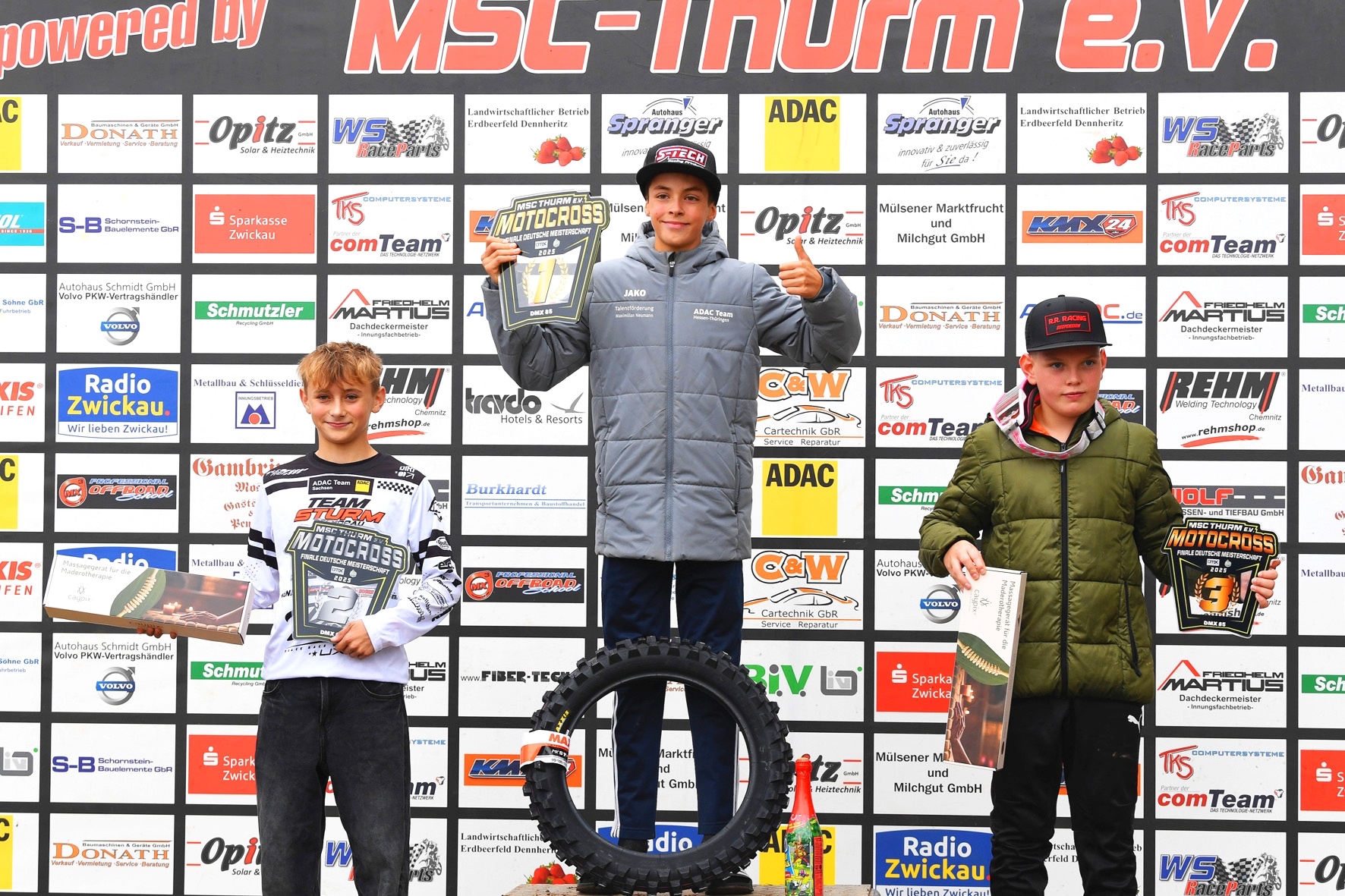 Für das beste Ergebnis aus sächsischer Sicht sorgte in der 85er-Klasse Tom Sönke Hänel aus Grünhainichen. Er lag schon vor dem Rennen relativ komfortabel auf Silberkurs und brachte die Vize-Meisterschaft mit einem Laufsieg sowie anschließend einem zweiten Platz souverän in trockene Tücher. In der Tageswertung musste er dennoch Maximilian Neumann vom ADAC Hessen-Thüringen den Vortritt lassen, denn der hatte die genau umgekehrten Ergebnisse erzielt. Nach Motocross- Arithmetik entscheidet bei Punktgleichheit der zweite Lauf liegt, was Maximilian Neumann in die Vorhand brachte.