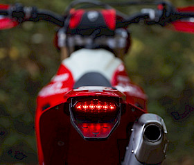 Der auffälligste Unterschied ist die Verwendung eines 18-Zoll-Hinterrads, typisch für den Enduro-Bereich. Darüber hinaus ist die Ducati Desmo450 EDS mit Handschützern und kompletten Lenkerarmaturen ausgestattet. Ebenso verfügt das Ducati Enduro-Modell über eine minimalistische Kennzeichenhalterung mit integrierter LED-Leuchte und ein LED-Scheinwerferschild an der Vorderseite.