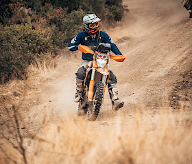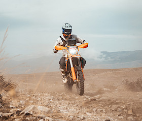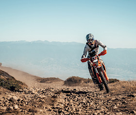 Vor der zweiten, 66km langen Etappe, hatten wir eine kurze Neutralisationszone im Bivouac. Wir hatten Zeit, um schnell zu tanken und einen Riegel zu essen, bevor es weiter ging. Die Etappe führte uns über weitläufige und schnelle Hügel und ich fühlte mich nach meinem kleinen Schreckensmoment am Mittag, wieder richtig wohl. Mein absolutes Highlight war ein Stück, welches uns durch ein breites ausgetrocknetes Flussbett führte. Hier kam die 450er richtig auf ihre Kosten und mit Gewicht über dem Hinterrad wühlte ich mich im fünften Gang durch das lose Geröll. Tag 6 auf Platz 19 sicher beendet!