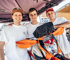 Nach dem kleinen Schrecken nahm ich das Tempo etwas heraus und brachte die Etappe ohne Zwischenfälle auf Platz 18 zu Ende. Hans wartete bereits im Bivouac und Emil kam nur etwa eine halbe Stunde später an. Unser griechischer Kumpel Stefanos hatte heute weniger Glück. Er stürzte relativ früh am Tag mit hoher Geschwindigkeit, brach dabei seinen Helm auf beiden Seiten und stand wie durch ein Wunder direkt wieder auf. Sein Roadbookhalter war allerdings kaputt und so musste er fast den ganzen Tag hinter anderen Fahrern herfahren. Am Abend halfen wir ihm sein Motorrad wieder zu reparieren und organisierten einen neuen Helm, damit auch er am kommenden Tag wieder an den Start gehen konnte.