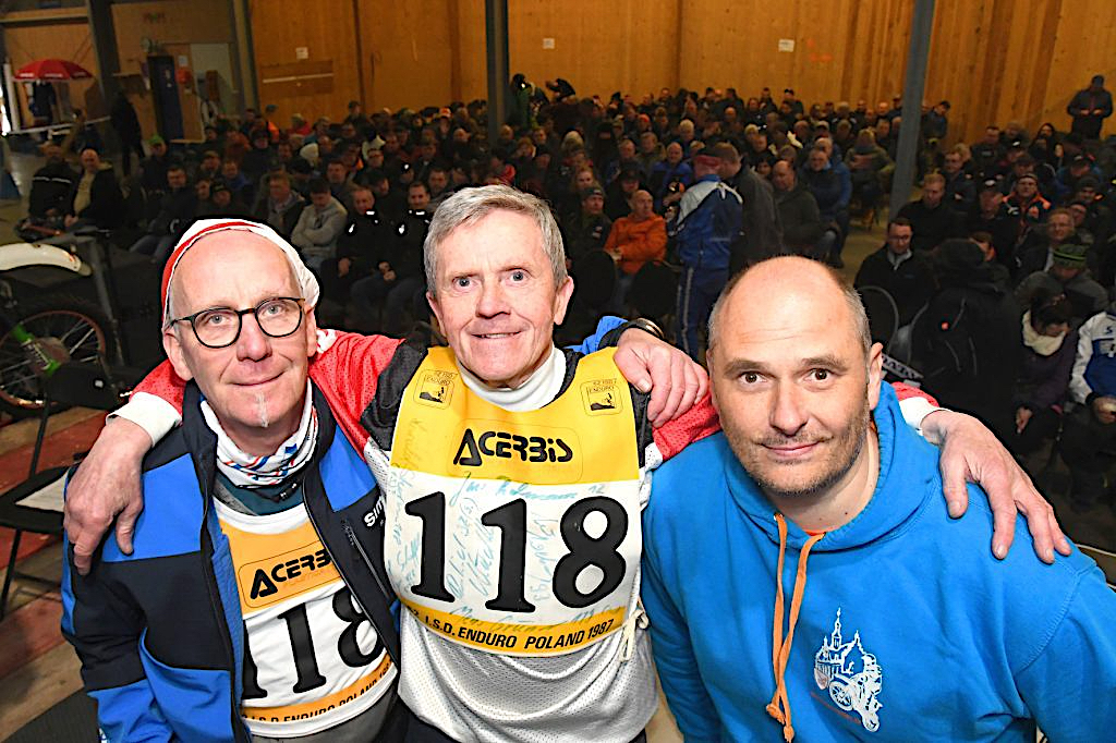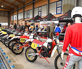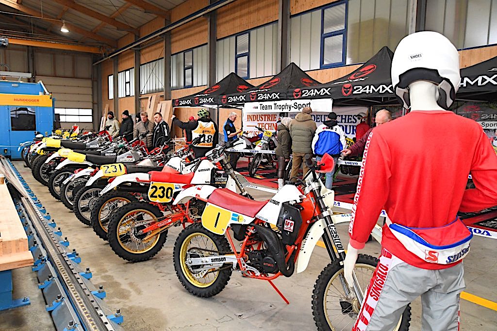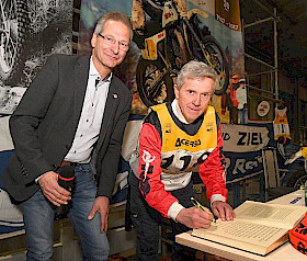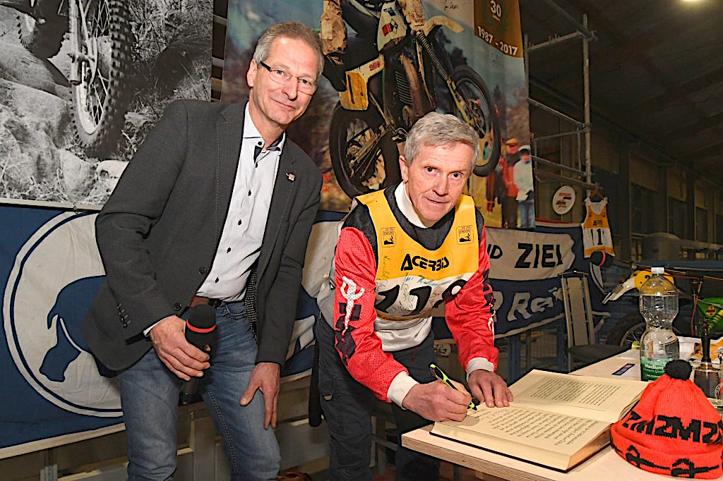 Am Vorabend der diesjährigen Dahlener Geländefahrt hatte sich der Gastgeber-Verein zusammen mit dem Torgauer Ronald Preuß und dessen Helfer, passend zum runden Geburtstag, einen schönen Blick in die Historie einfallen lassen. In der Werkhalle der Firma Abbundzentrum Dahlen hatte man eine schöne Veranstaltung mit dem Themenschwerpunkt Harald Sturm und seine Erfolge organisiert. Bei dieser zitierte Ronald Preuß etliche Passagen aus dem 2017 erschienenen aber längst vergriffenen Buch „Ein Leben auf zwei Rädern – Die MZ-Legende Harald Sturm“ und der Stargast gab dazu so manche Episode ergänzend preis. Schon ober der rund 500 wegen ihm anwesenden Fans war „Harry“ ziemlich überrascht. Geradezu überwältigt war er, als der Dahlener Bürgermeister Matthias Löwe ihn um einen Eintrag ins Goldene Buch der Stadt bat. Garniert war die Geschichtskunde mit einer absolut sehenswerten Ausstellung mit 23 echten Raritäten als Enduro-Technik-Zeitzeugen (11 MZ und 12 Simson) aus den 1960er-, 1970er- und 1980er-Jahren. Die meisten waren Ex-Werks-Geländemaschinen und ließen die Herzen schon am Nachmittag ebenso höher schlagen, als der unterhaltsame Abend mit Harald Sturm.