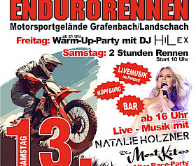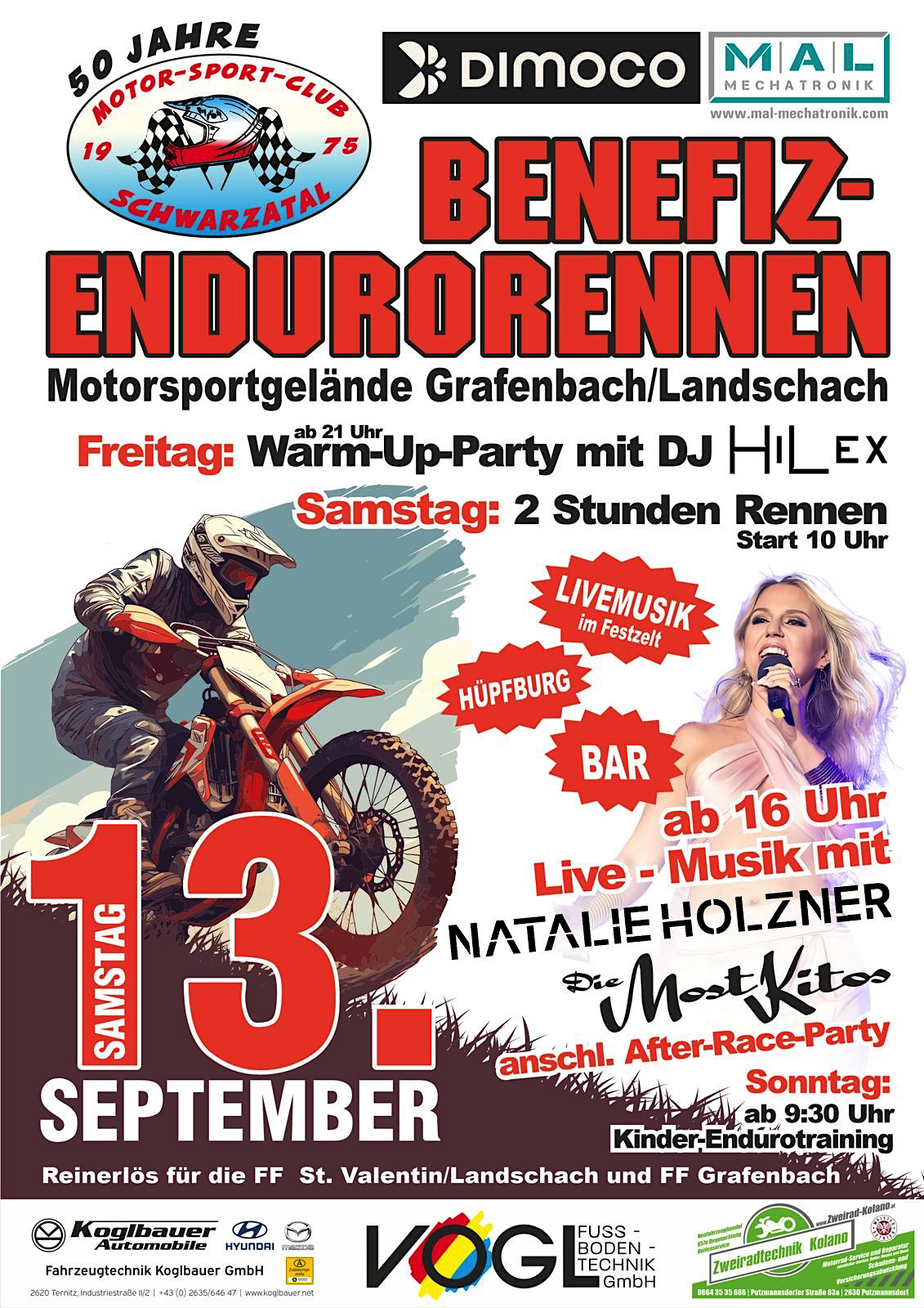 Anlässlich des 50 jährigen Clubbestehens veranstaltet der MSC Schwarzatal am 13. September ein 2 Stunden Benefiz Enduro, bei dem der Reingewinn wieder an ein gemeinnütziges Projekt gespendet wird. Begleitend zum Event, ein hochkarätiges Rahmenprogramm mit Warm-Up Party am Freitag ab 21 Uhr, am Samstag anschließend an das 2. Rennen ab 16 Uhr die After Race Party mit der Siegerehrung und Live-Musik.