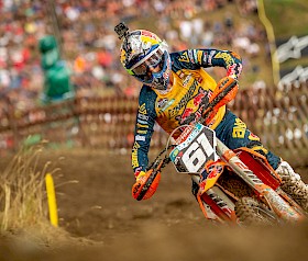 MXGP Race 1 Top Ten: 1. Jeffrey Herlings (NED, KTM), 34:28.981; 2. Antonio Cairoli (ITA, KTM), +0:31.992; 3. Tim Gajser (SLO, Honda), +0:35.048; 4. Clement Desalle (BEL, Kawasaki), +0:42.339; 5. Jeremy Van Horebeek (BEL, Yamaha), +0:47.791; 6. Gautier Paulin (FRA, Husqvarna), +0:51.183; 7. Romain Febvre (FRA, Yamaha), +0:53.685; 8. Alessandro Lupino (ITA, Kawasaki), +0:57.076; 9. Glenn Coldenhoff (NED, KTM), +1:00.975; 10. Jeremy Seewer (SUI, Yamaha), +1:01.390.