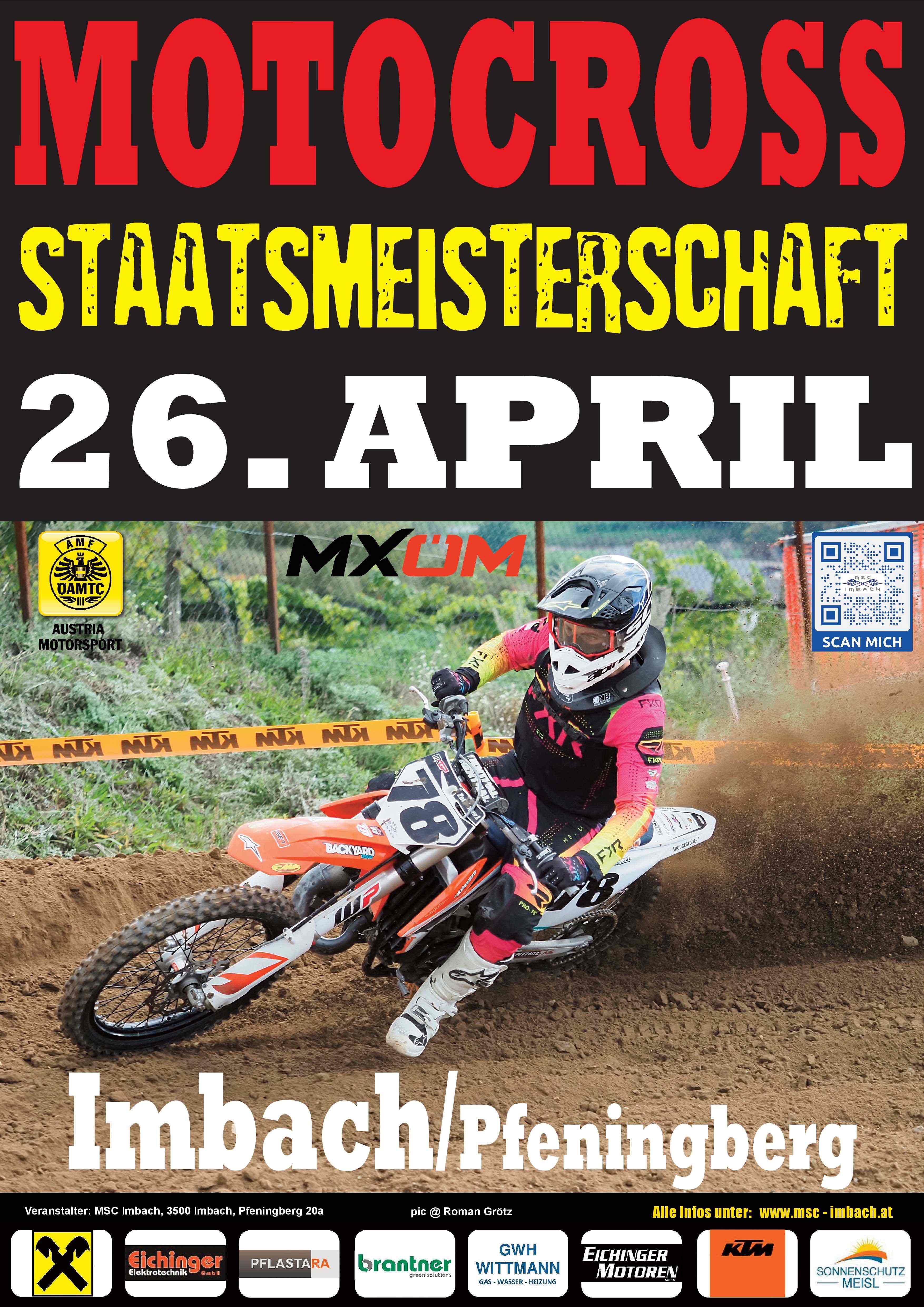 Die erste Motocross-Staatsmeisterschaft in Niederösterreich im neuen Jahr findet in Imbach statt. Es kommen alle 4 ÖM-Klassen zur Austragung, neben Spitzenfahrern aus ganz Österreich sind auch wieder internationale Top-Piloten am Start. Der MSC Imbach freut sich auf viele Fans und auf einen spannenden Renntag!