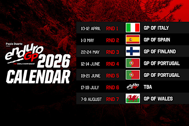Um auf dem Erfolg von 2025 aufzubauen, wird die Meisterschaft im Jahr 2026 in sieben Runden ausgetragen. Beginnend Anfang April macht die Paulo Duarte FIM EnduroGP-Weltmeisterschaft zweimal in Italien, Spanien, Finnland und Portugal Station, bevor sie im August in Wales endet. Die vorletzte Runde im Juli muss noch bestätigt werden.